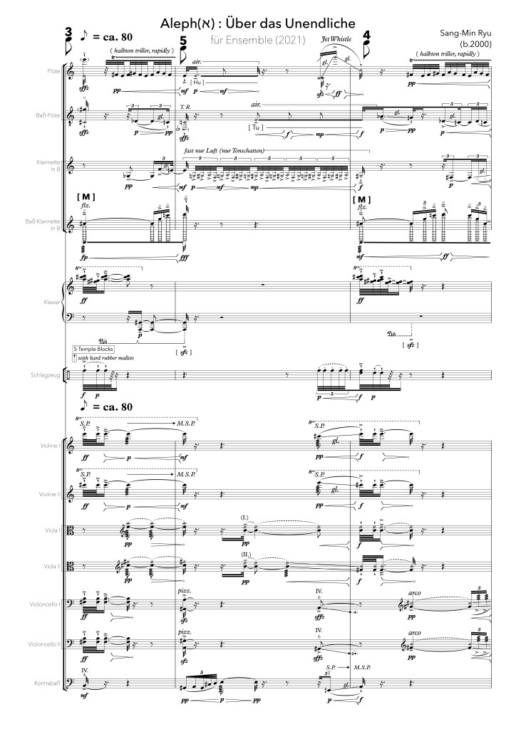 『Aleph (ℵ): Über das Unendliche』 is a piece that explores cardinality and size within the concept of infinity (Aleph number). The intense attack at the intro, which serves as the motif of this piece, creates a kind of resonance, producing infinite waveforms of different concentrations. These waveforms develop with varying sizes and magnitudes, reaching their peak through the bass drum in “Chaos, Allegro e religioso” before finally resolving. At the end of the piece, the leaping phrase of the flute concludes with a linear movement, expressing the concept of infinity.