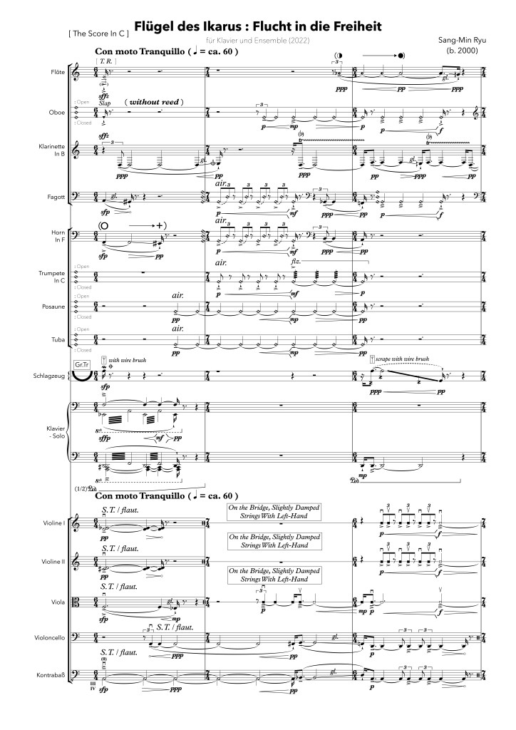 In 『Flügel des Ikaus: Flucht in die Freiheit』 for piano solo and ensemble, I break away from the speculative or abstract materials I was usually interested in and focus on more concrete ideas, drawing inspiration from real materials. Based on this, I musicalized ‘The Flight of Icarus’ from the Story of Daedalus and Icarus in Greek mythology.