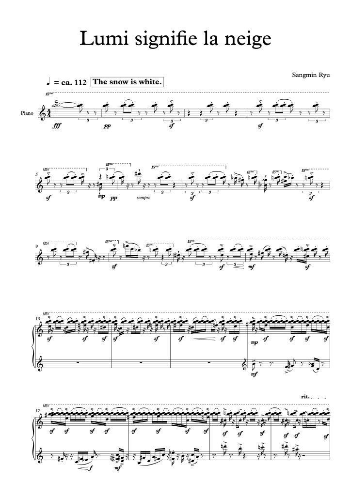 『Lumi signifie la neige』 begins with the chord ‘B + C’ in a half-tone relationship, which expresses a landscape covered with snow. This chord in the high range acts as a material that permeates the entire piece, represented by a plot structure in which Lumi finds her identity (or attribute).