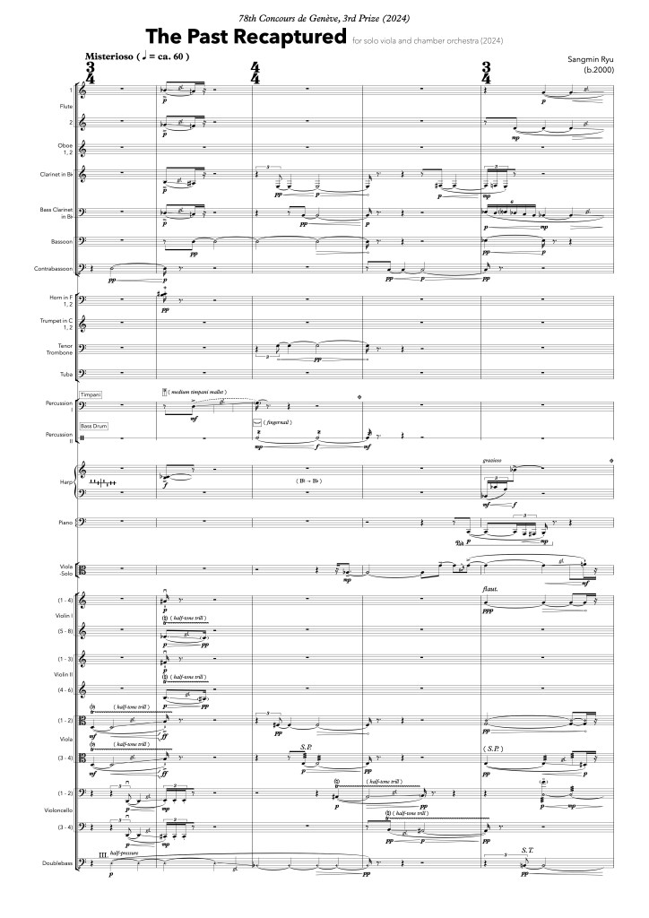 For a long time (Longtemps), I have dreamed of creating a single work that could encapsulate my life. It truly begins only when faced with the necessity of ‘must write,’ not merely the desire to ‘want to write’, just as Marcel shifts from the apprenticeship to signs to the visitation. The main motif of this piece is the glissando, and it begins with a pedal glissando on the timpani. The glissando is not simply a carrier of pitch; it acts as a gesture reminiscent of the past. The solo viola mimics these gestures, singing various forms of glissandi, and often, the sound of tubular bells awakens our pasts.